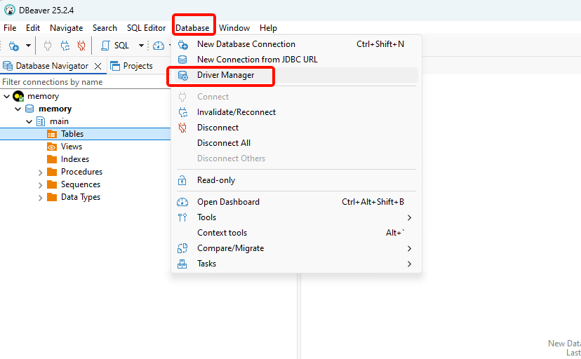 在顶部菜单栏中,选择 "Database" (数据库) > "Driver Manager" (驱动管理器)。