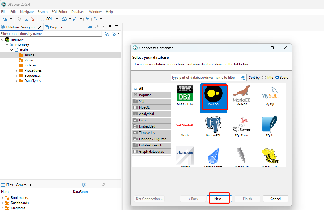 现在,您可以像以前一样创建新的数据库连接:单击 "New Database Connection" (新建数据库连接) 图标,选择 DuckDB。