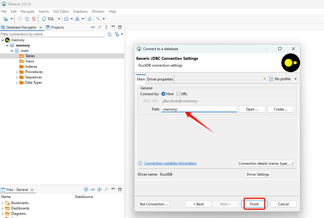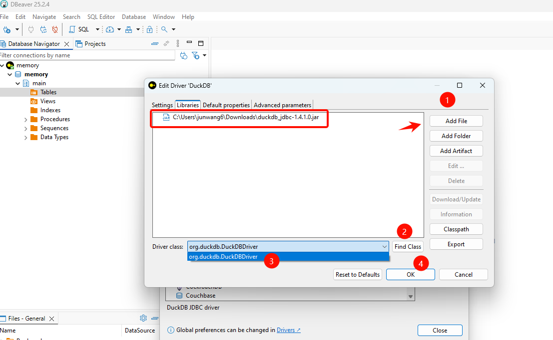 duckdb_jdbc-0.10.3.jar)。添加后,DBeaver 应该会自动检测到驱动程序类名。如果没有,请单击 "Find Class" (查找类) 按钮。通常,驱动程序类名为