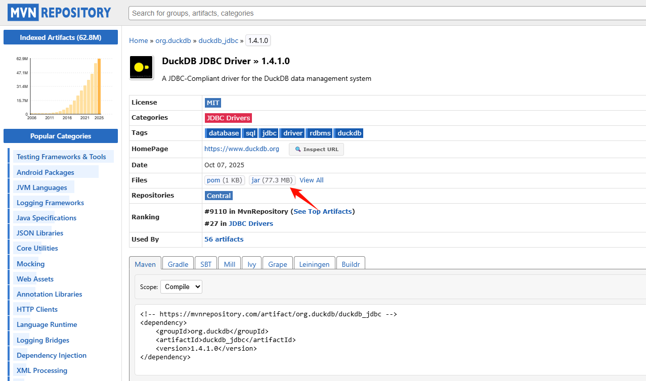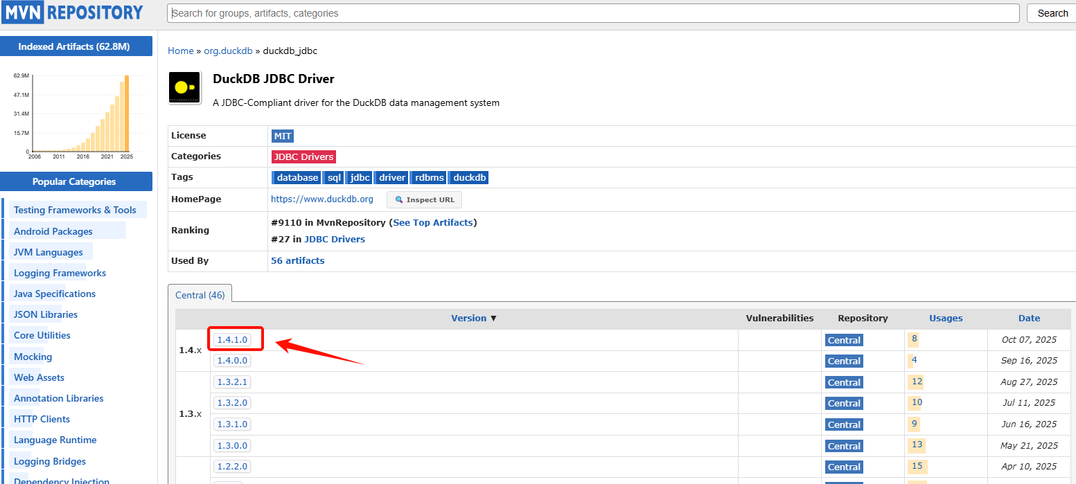 打开您的网络浏览器,访问 Maven Central 仓库的 DuckDB JDBC 页面。您可以使用此链接:https://mvnrepository.com/artifact/org.duckdb/duckdb_jdbc