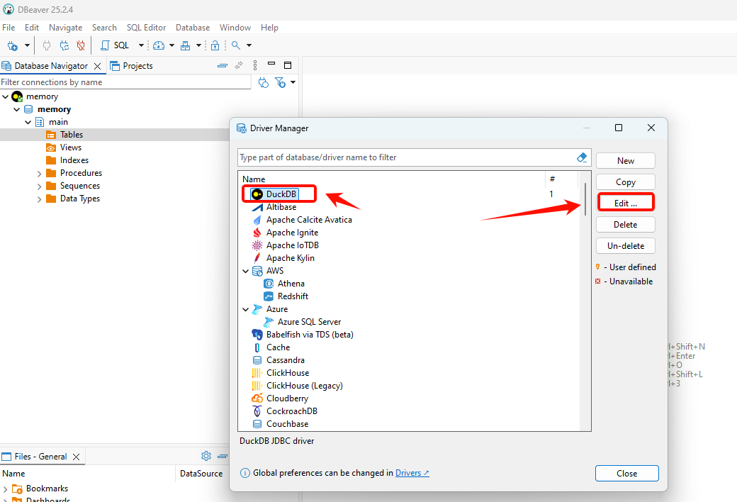 在驱动管理器窗口中,找到并选择 "DuckDB" 驱动程序,然后单击右侧的 "Edit" (编辑) 按钮。